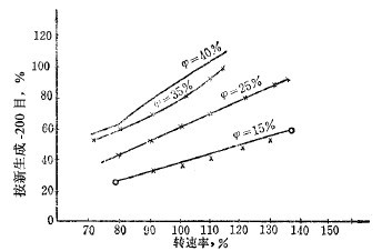 超臨界轉(zhuǎn)速運(yùn)轉(zhuǎn)不僅在理論上突破了公式(2-5)的局限性,而且可以提高磨機(jī)的處理能力。生產(chǎn)實(shí)踐指出,如果應(yīng)用恰當(dāng),超臨界轉(zhuǎn)速運(yùn)轉(zhuǎn)可以提高磨機(jī)的生產(chǎn)力,雖然功率耗相應(yīng)地增加,但比功率耗(即千瓦·時(shí)/噸)常常是降低的,如下表中的例子。磨機(jī)的轉(zhuǎn)速和裝球量是影響磨機(jī)生產(chǎn)率的兩個(gè)關(guān)鍵性的因素。超過(guò)nc值運(yùn)轉(zhuǎn)固然可以提高磨機(jī)生產(chǎn)率,但要求減少裝球量,而減少裝球量又會(huì)使生產(chǎn)率降低。所以不能片面地采用大幅度提高轉(zhuǎn)速及大幅度減少裝球量的辦法,這反而會(huì)使生產(chǎn)率下降,如下圖3-2-6反映的情況。當(dāng)裝球率減少到25%以下,即使將轉(zhuǎn)速率提高到145%,生產(chǎn)率也達(dá)不到裝球率為35~40%,(轉(zhuǎn)速率為110~120%的。并且轉(zhuǎn)速太高,磨機(jī)振動(dòng)很厲害,也會(huì)造成危險(xiǎn)。