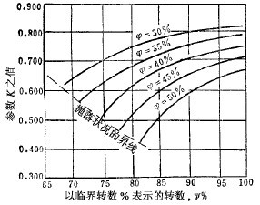 這兩個公式指出:最外層球的脫離角僅與轉(zhuǎn)速率有關(guān),而最內(nèi)層球的脫離角,即與轉(zhuǎn)速率又與裝球率(用K標志)有關(guān)。根據(jù)上面講的情況可知,為了保證最內(nèi)層球也能處于拋落狀態(tài)(即所有球?qū)佣际菕伮涞模b球率與轉(zhuǎn)速率必有一確定關(guān)系。而且這種關(guān)系又必有臨界點,過了這種臨界點,磨機的轉(zhuǎn)速不足以使暈內(nèi)層球作拋落,鋼球于是處于瀉落狀態(tài)。這里將用計算結(jié)果