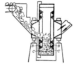 偉斯頓對干式自磨過程的理論進(jìn)行了較長時間的研究。他對干式自磨機(jī)中礦石粉碎過程的運動情況作了如下的描述: