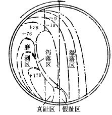 如圖所示,新給礦中的小粒,由給料端進(jìn)入,沿A面均勻地落于筒體底部中心,然后向兩側(cè)擴(kuò)散。大塊具有較大的動能,總是趨向較遠(yuǎn)的一側(cè),但其中有一部分必然要和AB面相碰,然后向另一側(cè)返回,因之,也使大塊得到均勻分布。A——A、B——B 在這里的作用是防止給入物料有害的偏析。自排礦端沿下面返回的顆粒如同新給料中的細(xì)粒一樣,均勻地落于筒體底部的中,然后向兩邊擴(kuò)散。大塊和細(xì)粒在筒體底部沿軸向運動,方向正好相反,于是產(chǎn)生磨剝作用。