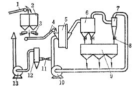 未被收集的微細(xì)物料在閉路風(fēng)路系統(tǒng)中循環(huán)。閉路系統(tǒng)中主風(fēng)機出口至磨機入口段,其靜壓值有部分為正壓,粉塵易從這一段逸出。為使主風(fēng)路系統(tǒng)在負(fù)壓條件下工作,防止灰塵溢入室內(nèi)漫延,減少微細(xì)物料和水分在主風(fēng)路系統(tǒng)中造成惡性循環(huán),設(shè)有副風(fēng)路系統(tǒng)。副風(fēng)路系統(tǒng)設(shè)在主風(fēng)機與自磨機之間,由文氏管11洗滌器12及輔風(fēng)機13組成。經(jīng)副鳳路系統(tǒng)凈化后的氣流排于大氣中。