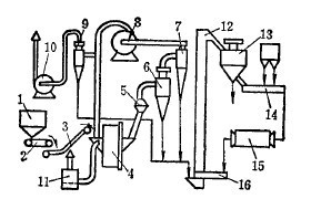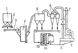 被粉碎的物料在主風(fēng)機10(主風(fēng)機的作用是使調(diào)節(jié)好的空氣流在自磨機和分級機內(nèi)循環(huán)并運輸物料)造成的強大風(fēng)力作用下被連續(xù)排出,沿著管道進入沉降箱6進行第一次分級,較粗的顆粒便沉降下來。細(xì)小的物料繼續(xù)進入旋風(fēng)分離器7,進行第二次分級,這時絕大部分細(xì)小物料都沉降。已在沉降箱和旋風(fēng)分離器中沉降的物料靠鎖氣器8間斷排出,貯存在粉礦倉9中,以便進行干式磁選。