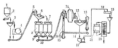 物合并,用帶式輸送機(jī)5送至貯礦倉8。為了給自磨機(jī)配礦,在貯礦倉8上設(shè)有重型振動(dòng)篩6,將粗碎后的原礦分成為350~100毫米與100~0毫米兩個(gè)級別(即人工配比),分別用可逆帶式運(yùn)輸機(jī)7卸入貯礦倉8內(nèi)。存于礦倉內(nèi)的礦石由電振給礦機(jī)19按比例給至集礦帶式運(yùn)輸機(jī)10,輸送到自磨機(jī)11內(nèi)。自磨機(jī)與直線振動(dòng)篩12構(gòu)成半閉路循環(huán),自磨機(jī)的排礦經(jīng)直線振動(dòng)篩12分級后,篩上產(chǎn)物在由三條帶式運(yùn)輸機(jī)13、14、16返回自磨機(jī)的過程中,在第二條帶式運(yùn)輸機(jī)14的首輪處安有磁滑輪15,篩上產(chǎn)物被分成為磁性產(chǎn)物和非磁性產(chǎn)物,磁性產(chǎn)物返回自磨機(jī)再磨,非磁性產(chǎn)物接近尾礦品位,故丟棄。直線振動(dòng)篩的篩下產(chǎn)物用泵17揚(yáng)至礦漿分配器18,經(jīng)永磁磁力脫水槽19脫泥后自流至第二磨礦段,第二磨礦段為螺旋分級機(jī)20作預(yù)先檢查分級與格子型球磨機(jī)21, 組成的閉路循環(huán)。分級溢流細(xì)度為80%~200目,為自磨系統(tǒng)的合格產(chǎn)物。