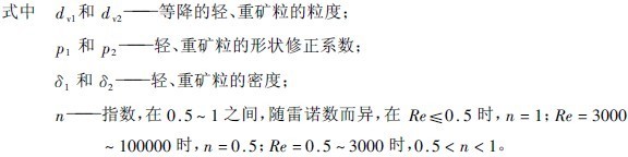 小密度顆粒的粒度與沉降末速度相等的大密度顆粒粒度之比值,稱為顆粒的等降比,其值大于1??梢愿鶕?jù)沉降速度相等的關(guān)系求出。