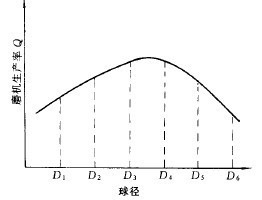 實驗室磨機的規(guī)格小,相應(yīng)的給礦粒度也小,試驗結(jié)果可作為中細磨機的球徑選擇依據(jù)。因為給礦粒度小,通常3~5mm以下,給礦粒度范圍窄,因此采用單種球徑球組進行試驗即可。選擇的球組不應(yīng)低于3組,較好的是5或6組,目的是要將待求更好的球徑包括在內(nèi),不漏掉較佳值。當其它參數(shù)固定不變時磨機指定級別在生產(chǎn)率與球徑之間的關(guān)系是一個單峰函數(shù),如圖3-5-2所示。如果選擇D1、D2、D3三種球,生產(chǎn)率曲線到D3時呈上升趨勢,無法判定D3,是較好的球徑值;同樣,選擇D4、D5、D6三種球時,也無法判定D4是較好的球徑值,只有使生產(chǎn)率曲線達到峰值和導(dǎo)數(shù)轉(zhuǎn)向時才能找出更好的值。