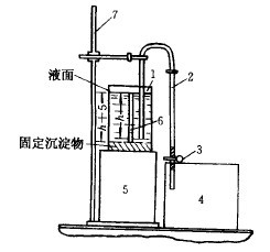 淘析法水析裝置也稱(chēng)薩巴寧沉降分析儀,如圖3-4-12所示。淘析過(guò)程是在一個(gè)直徑為70~100mm、高度為150~170mm的玻璃杯1中進(jìn)行的。杯內(nèi)裝有一根直徑約為6~10mm的虹吸管2。虹吸管的短管部分應(yīng)插入杯內(nèi),使其管口下端距固體沉淀物料面留有5mm的距離。虹吸管另一端帶有管夾3,插入到溢流收集槽4內(nèi)。
