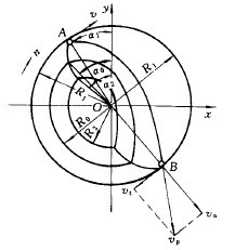 鋼球落到落回點(diǎn)B時(shí),其速度vp可分解為從磨機(jī)中心到落回點(diǎn)B方向的法向分速度vn及與筒體圓周相切的切向速度v1。法向速度vn用于沖擊礦塊,切向速度v1沿筒壁切線方向?qū)ΦV塊或礦粒產(chǎn)生磨剝作用。這里主要考慮鋼球?qū)ΦV塊的沖擊作用,故未考慮v1。