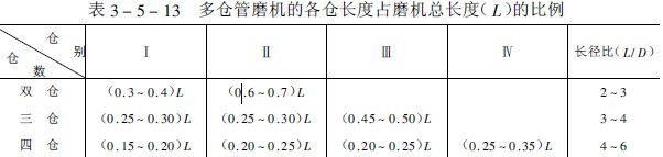 管磨機用于開流(路)系統(tǒng)時,選取較大的長徑比,一般L=(3.5~6.0)D;用作閉流(路)系統(tǒng)時,選用較小的長徑比,一般L=(3.5~6.0)D。多倉管磨機各倉(室)的長度按實際情況確定。但在許多情況下,磨機后的一個倉室(細磨倉)的長度較長,各倉(室)占筒體有效長度的百分數(shù),如表3-5-13所示。