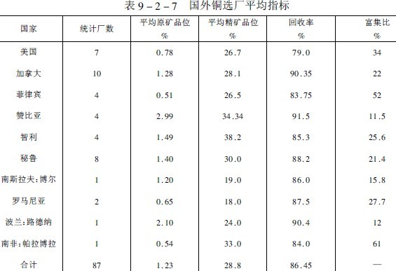 用浮選方法處理煉銅廢渣回收金屬,是近年來(lái)發(fā)展的一種新工藝。日本已在八座冶煉廠建立了處理爐渣的選礦車(chē)間。芬蘭的哈里亞伐爾塔廠以前用電爐貧化銅爐渣、將渣含銅降至0.6~0.7%,銅的回收率77%,后來(lái)改用浮選處理,尾礦含量降至0.3%(渣含銅)銅回收率提高到91.1%。一些國(guó)家銅選廠1981年的生產(chǎn)指標(biāo)列于表9-2-7。