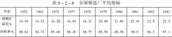 國(guó)內(nèi)銅選礦現(xiàn)狀我國(guó)現(xiàn)有32座大中型銅選廠,年產(chǎn)方噸以上精礦含銅量的有銅錄山、德興、白銀、易門(mén)、落雪等選廠??谔幚砹吭?000噸以上的有13座,500~3000噸的有15座。礦石入選品位平均為0.94%,雖然原礦品位逐年下降,但銅精礦品位則隨著選礦工藝的發(fā)展和技術(shù)進(jìn)步而逐年提高,如表9-2-8所列。