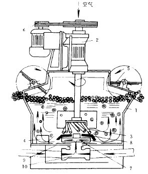 每個浮選槽均由槽體1、軸承體(連同中空主軸)2、斜棒葉輪3、穩(wěn)流器4、刮板5、傳動裝置6及凸臺等組成。吸入槽中,除有上述部件(凸臺由壓蓋代替)之外,在其中空主軸的下端還有提升葉輪7、壓蓋8和底盤9(見圖1)。浮選槽只起浮選作用。吸入槽除起浮選作用外,還兼有吸漿能力,即把槽外的礦漿通過提升葉輪的作用并經(jīng)導管10吸入槽內(nèi)。穩(wěn)流器是由幾十條垂直放置的曲率不同的圓弧板所組成。凸臺(及壓蓋)是用穩(wěn)流器的圓弧形邊緣壓在槽體底部的。