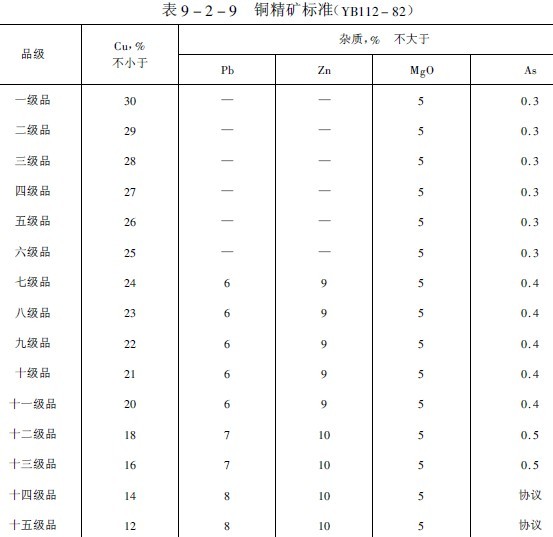 送往冶煉廠的銅精礦,由于礦石產(chǎn)地,礦石種類和銅選礦技術條件的不同,其化學成分和礦物組成是極其復雜的。冶煉廣對這些化學成分和礦物組成不作具體規(guī)定,僅根據(jù)冶煉方法,冶煉工藝特點及冶煉技術的不同,對某些成分加以適當限制。但出于冶煉對精料的要求,以及對選冶聯(lián)合成本的考慮,對入廠精礦的含銅品位規(guī)定了十五個等級(表9-2-9)。