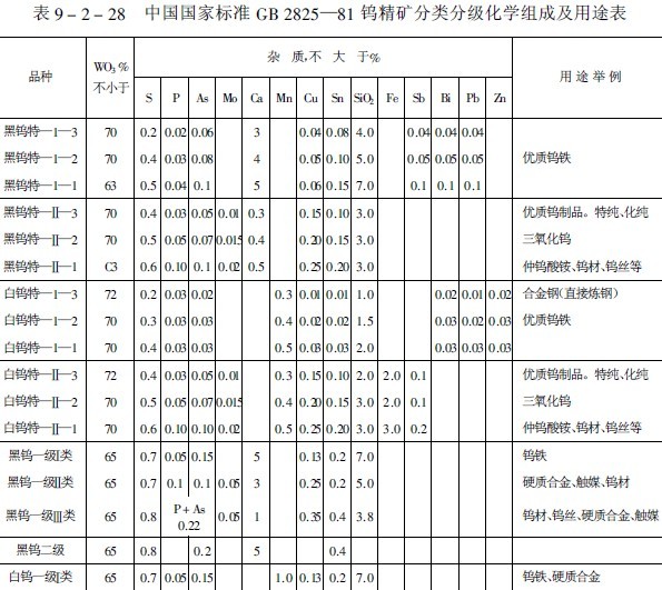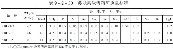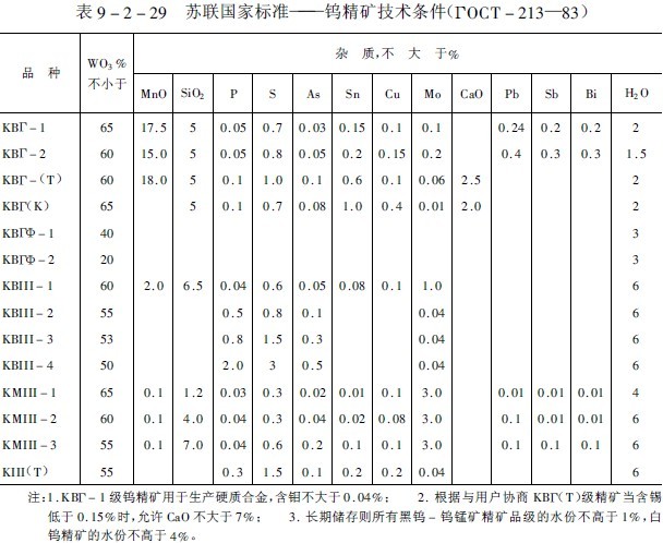 表9-2-29及表9-2-30為蘇聯(lián)國家鎢精礦產(chǎn)品標準,表9-1-31為國外質優(yōu)鎢精礦產(chǎn)品標準。
