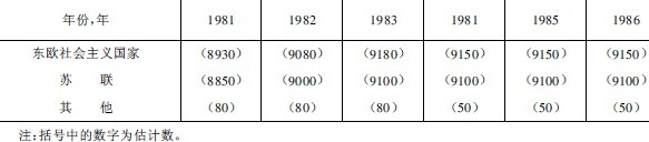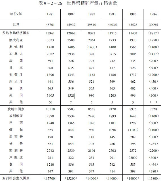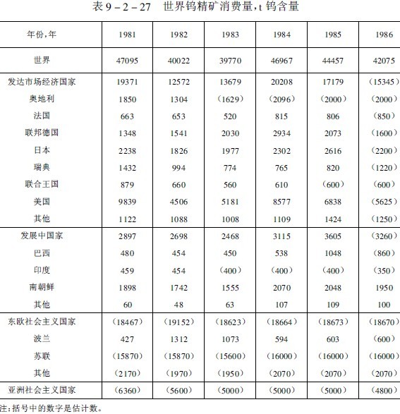 根據(jù)聯(lián)合國貿(mào)易和發(fā)展會議商品委員會鎢委會1986年11月第18屆會議報告資料,近幾年世界鎢精礦的產(chǎn)量和消費(fèi)量分別列于表9-2-26及表9-2-27。