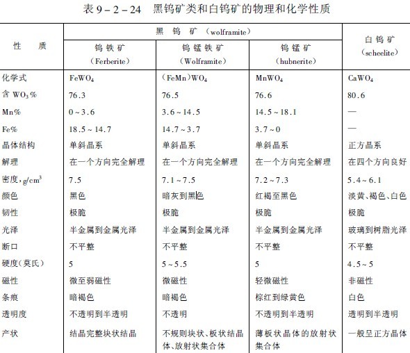 白鎢礦(CaWO sub 4 /sub )是鈣鎢酸鹽,結(jié)晶呈正方晶系,鉬可能取代白鎢礦中的鎢,而形成一種類質(zhì)同象的鉬酸鈣(CaMoO sub 4 /sub )礦。白鎢礦在紫外線輻射感應(yīng)下,發(fā)出鮮明的藍(lán)白色熒光,當(dāng)?shù)V物中有鉬存在時(shí),會(huì)改變熒光的顏色,隨著鉬的含量增加,逐漸由藍(lán)色變?yōu)槊咨?,淡黃色或橙色。表9-2-24是黑鎢礦類和白鎢礦的物理和化學(xué)性質(zhì)。