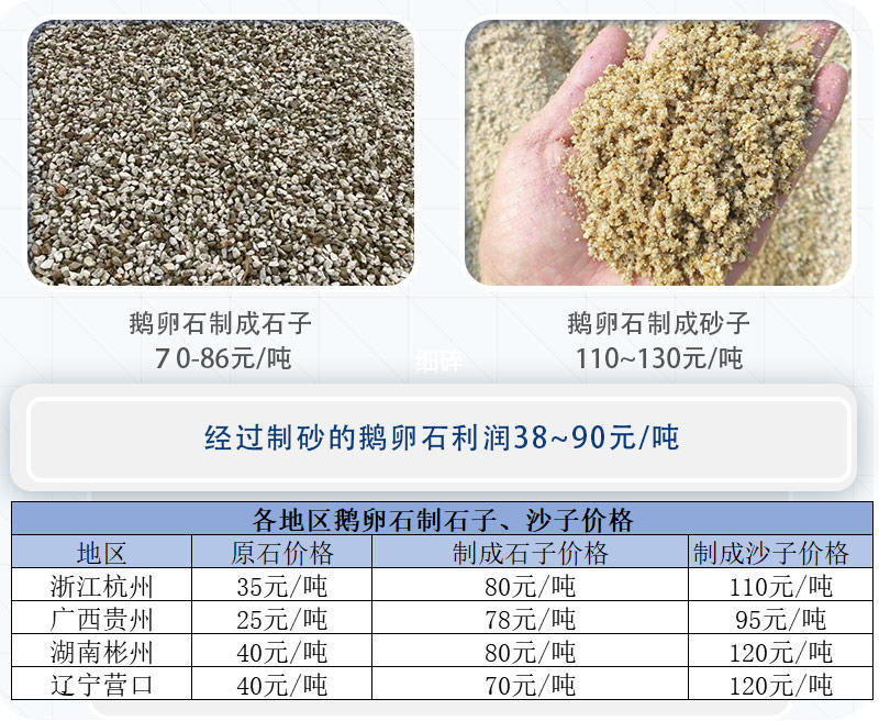 鵝卵石制的沙就是行業(yè)內常說的機制砂,其每個地區(qū)的價格都會有所差別,且還會隨著市場的需求而波動,并沒有固定的數字,但是從砂石骨料網在六月中詢統計的數據中得知,大部分地區(qū)鵝卵石制成的石子價格,鵝卵石制成的沙子價格在95-120元/噸不等。對比制砂前每噸25-40元左右的鵝卵石價格,其中的利潤是比較可觀的。