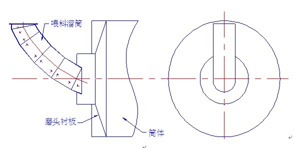 由于中空軸也隨著筒體一起運(yùn)轉(zhuǎn)及物料和中空軸之間的摩擦力存在,故實(shí)際上這兩種進(jìn)料方式的物料大都是從上圖↑中EFM處進(jìn)入磨內(nèi)的。滑履磨多采用進(jìn)料溜筒直接進(jìn)料如下圖↓,通常進(jìn)料點(diǎn)多選擇在磨機(jī)進(jìn)口的中心線靠下處。