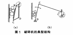 顎式破碎機兩種典型結(jié)構(gòu)如下圖1所示。圖1-a所示顎式破碎機,由機架AD、曲軸AB、 動顎板BC、肘板CD組成。圖1-b所示的顎式破碎機,曲柄AB帶動連桿BC和搖桿CD運動,它與前一類顎式破碎機雖然采用相同的曲柄搖桿機構(gòu),但工作原理不同。
