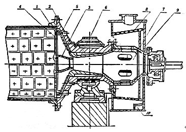 1、如圖1所示的中心傳動(dòng)中心卸料端。它的卸料篦子1用螺栓5與磨頭2連結(jié)在一起,在卸料篦子與磨頭之間有葉板4,在葉板中間裝有卸料錐3,物料由卸料篦子1的孔排出后,被葉板4帶起,當(dāng)物料被帶到上部時(shí),便由葉板上滑下,經(jīng)卸料錐3滑到軸頸內(nèi)的截頭漏斗6內(nèi),后從中間接管7上的橢圓孔落到控制篩8上,篩8用螺釘固定到中間接管7的法蘭盤(pán)上,隨法蘭盤(pán)旋轉(zhuǎn)。9為卸料罩子,物料成品由罩子底部卸出,落入運(yùn)輸機(jī)中,沒(méi)有通過(guò)篩子的粗粒物料,沿篩子滑下來(lái)從孔10卸出。