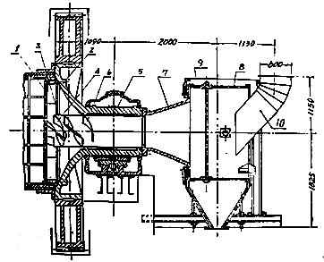 3、邊緣傳動(dòng)球磨機(jī)的卸料端(圖3)。卸料篦子1和磨頭2間有葉片3,在篦子的中部裝有螺旋葉片4,葉片3能將物料帶起并撒在螺旋葉片4上,通過(guò)螺旋葉片4和裝在套筒5里的螺旋葉片6使物料順暢地從軸頸中卸出,7為漏斗,用螺釘固定在軸頸的端面上,物料沿著漏斗落到控制篩8上,9為機(jī)罩,10為通風(fēng)管道與排風(fēng)機(jī)和收塵系統(tǒng)相聯(lián)結(jié)。